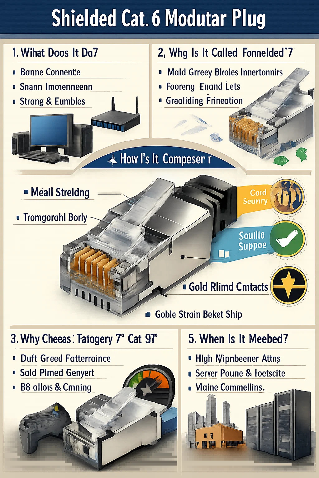 Isto plugue modular Cat.6 blindado , simplesmente, é um conector de cabo de rede com uma “blindagem protetora”. Se você já viu conectores de cabos de rede com uma caixa de metal brilhante, é isso.