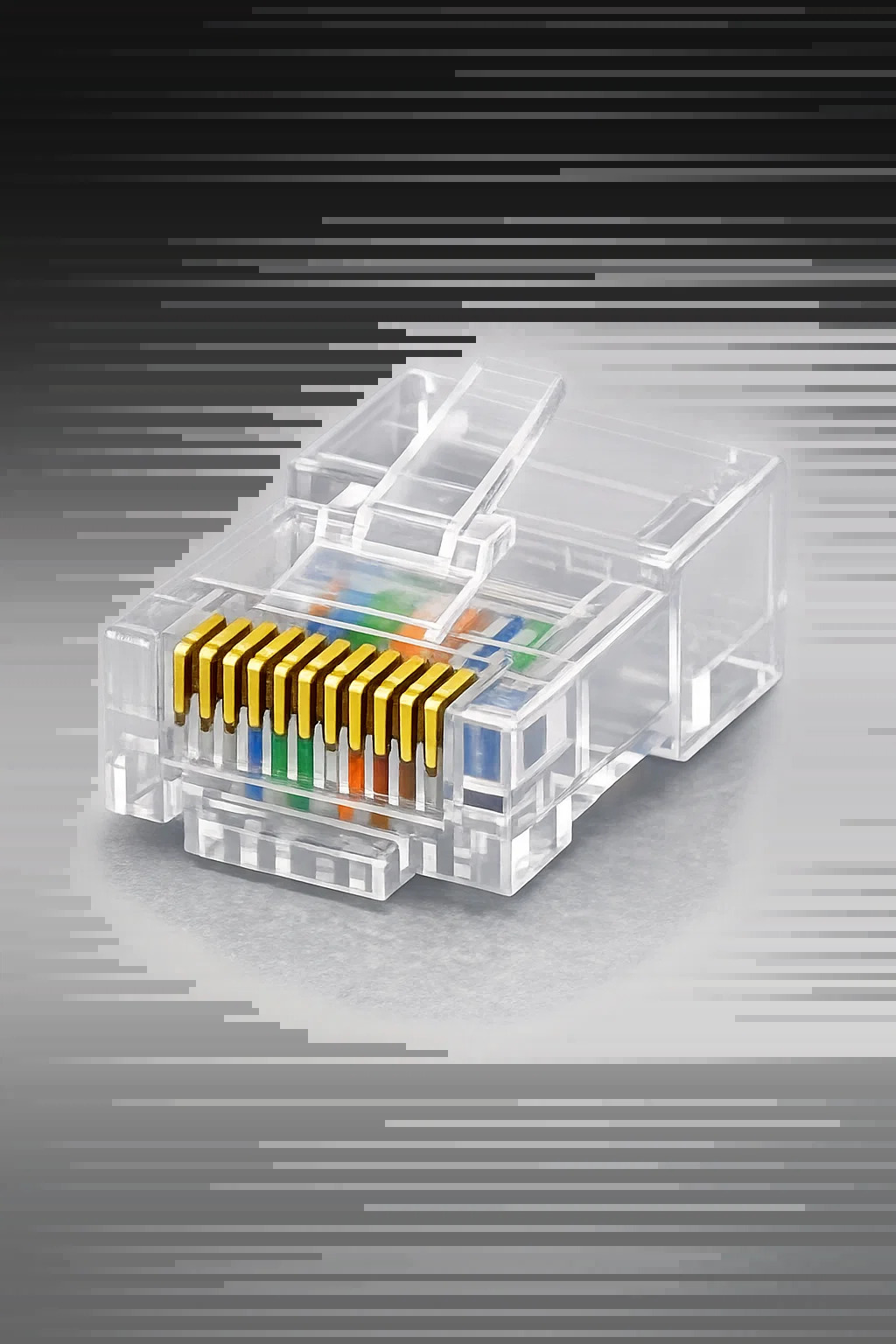 Material totalmente plástico: Este plugue modular 10P8C Cat.5e não blindado é feito inteiramente de plástico transparente ou translúcido, sem o invólucro de metal brilhante na parte externa.
