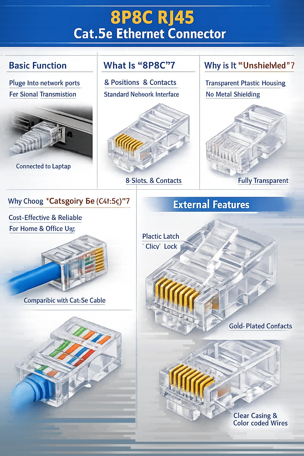 Isto plugue modular 8P8C Cat.5e não blindado é na verdade o tipo mais comum de "conector RJ45" encontrado em muitas redes domésticas de banda larga, tanto no passado quanto no presente. É transparente, compacto e um componente fundamental para conexão em rede.