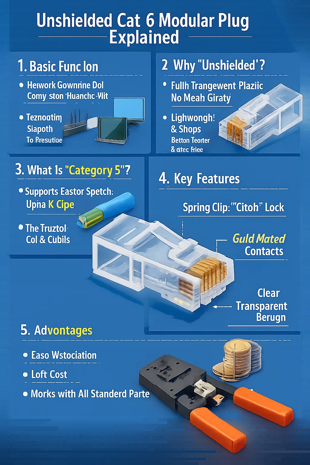 Isto plugue modular Cat.6 não blindado é na verdade o tipo mais comum de conector de cabo de rede transparente que vemos todos os dias. Se você estiver segurando um cabo de rede doméstico comum, o plugue de plástico transparente com um pequeno clipe de mola na extremidade provavelmente é desse tipo.